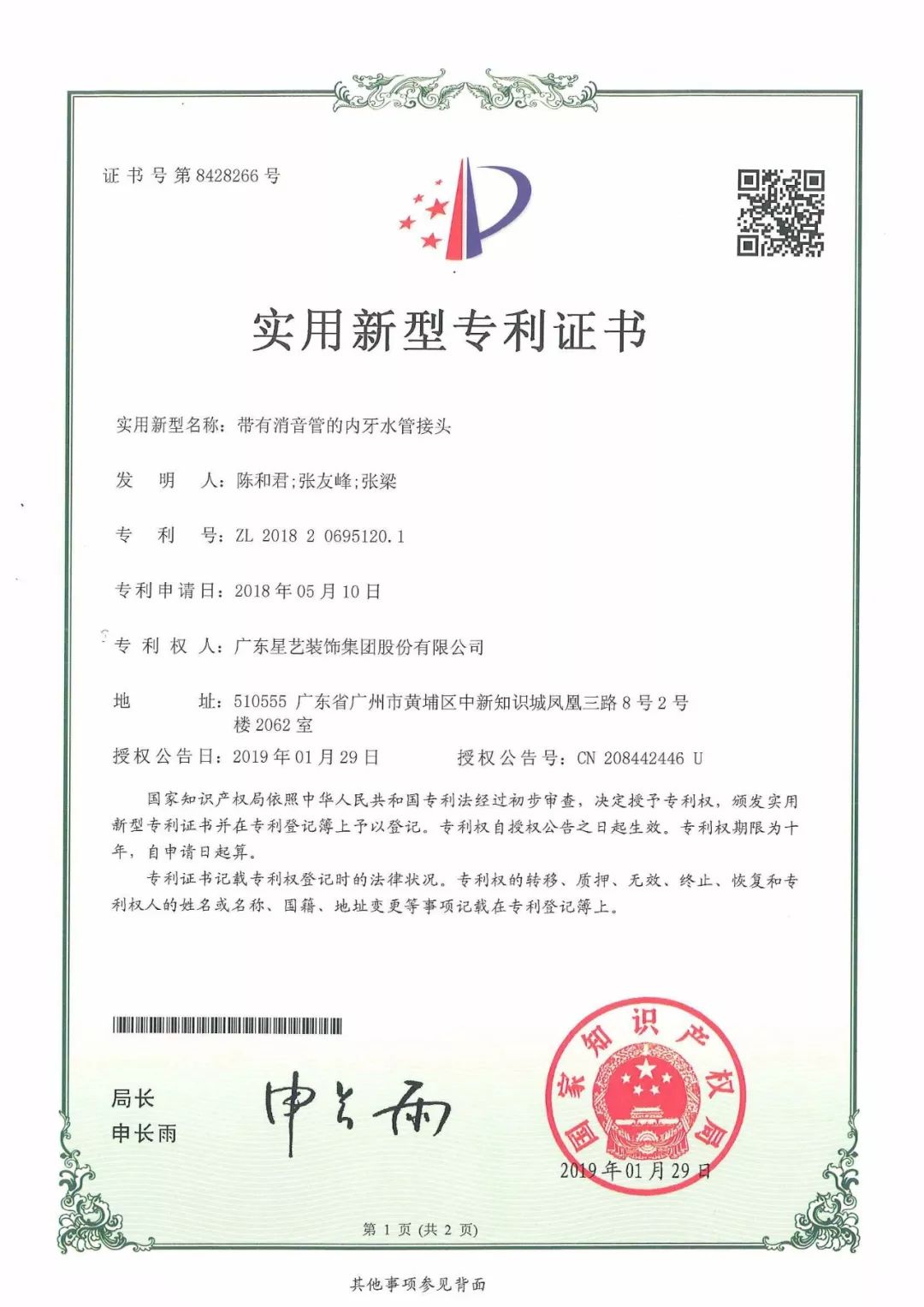 近日,星藝集團(tuán)取得了“帶有消音管的內(nèi)牙水管接頭”實(shí)用新型專(zhuān)利,并獲得了由國(guó)家知識(shí)產(chǎn)權(quán)局頒發(fā)的專(zhuān)利證書(shū)。