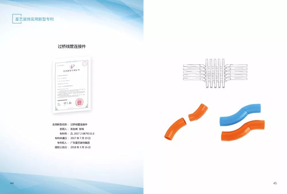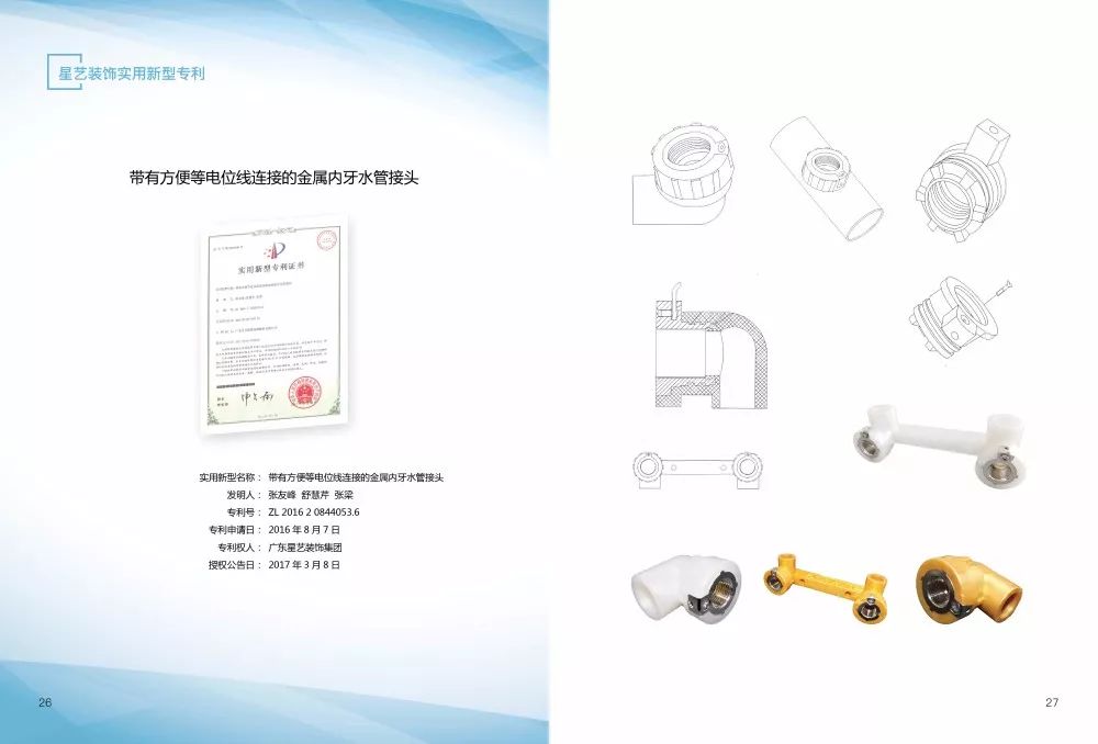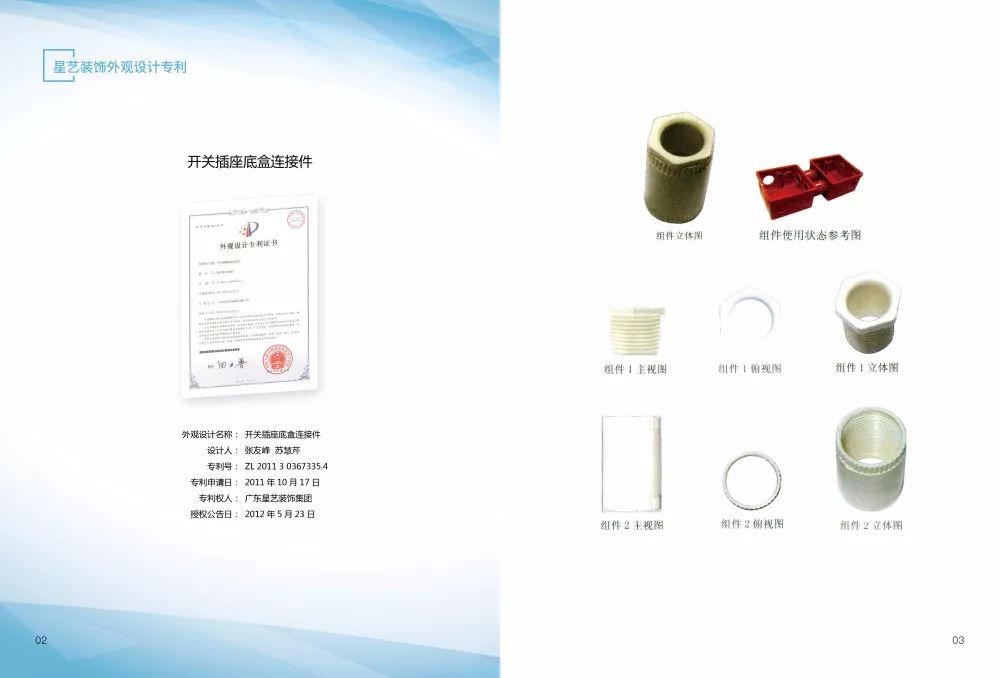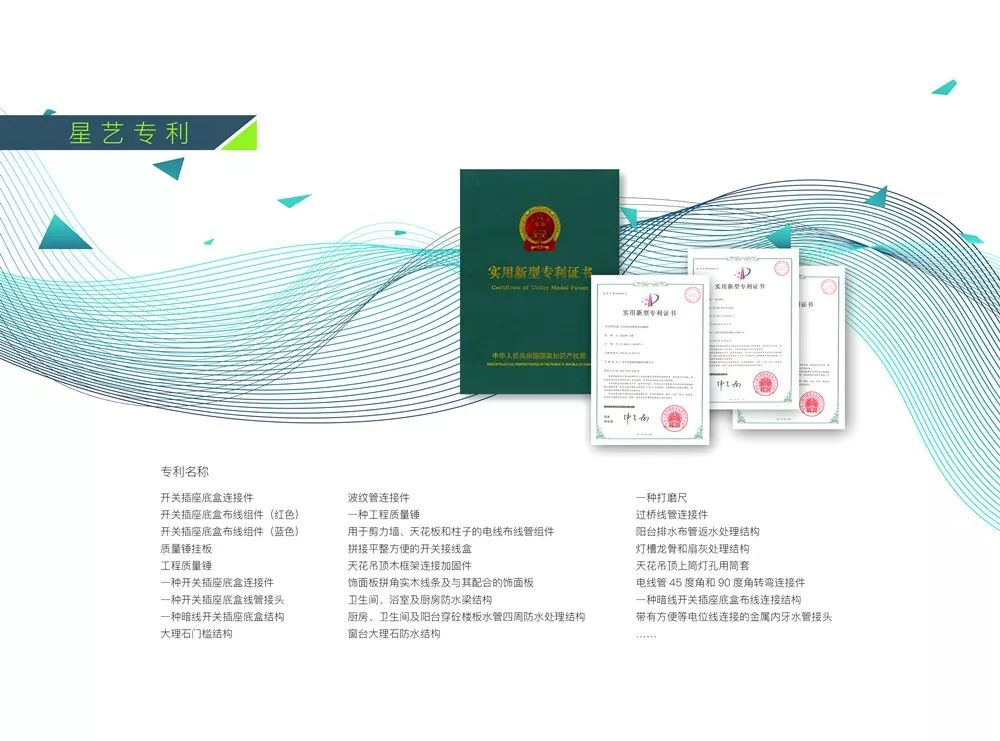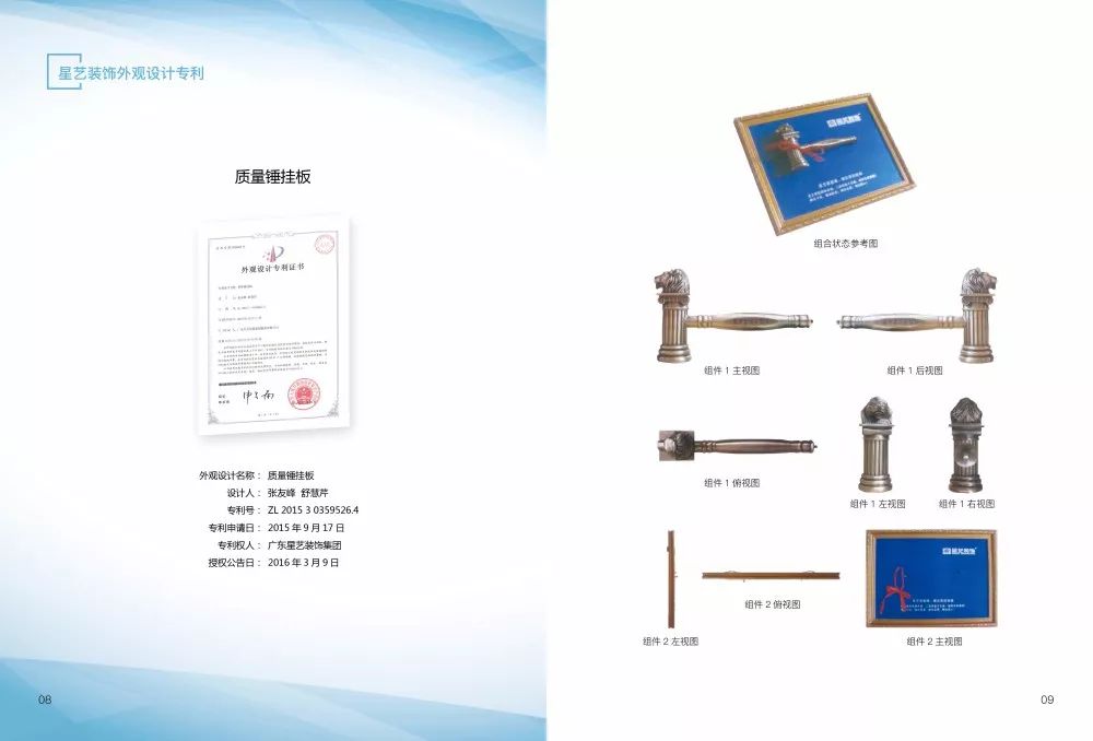 《星藝裝飾專(zhuān)利手冊(cè)》收集了星藝裝飾研發(fā)的幾十項(xiàng)國(guó)家實(shí)用新型專(zhuān)利和外觀設(shè)計(jì)專(zhuān)利。