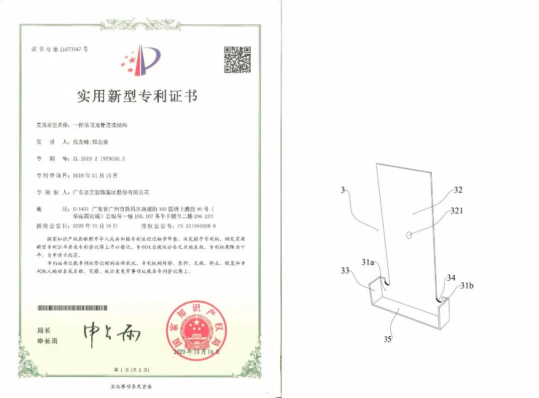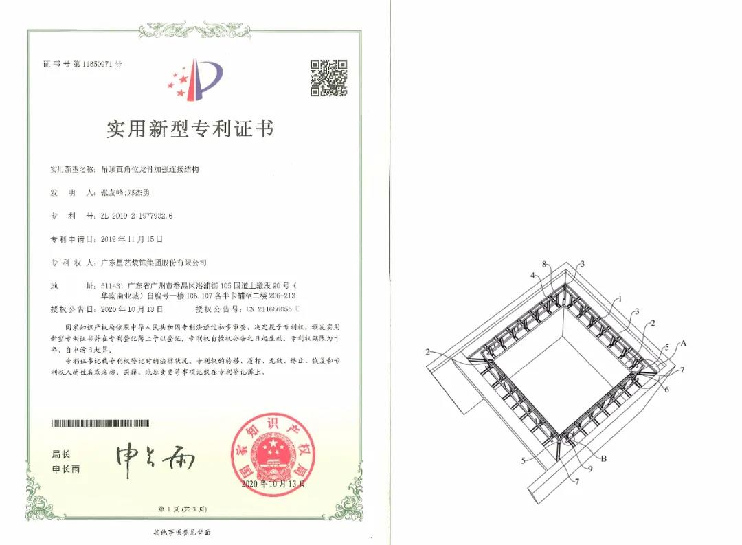 近日,星藝裝飾集團取得“吊頂直角位龍骨加強連接結(jié)構(gòu)”、“一種吊頂龍骨連接結(jié)構(gòu)”實用新型專利,并獲得由國家知識產(chǎn)權(quán)局頒發(fā)的專利證書。