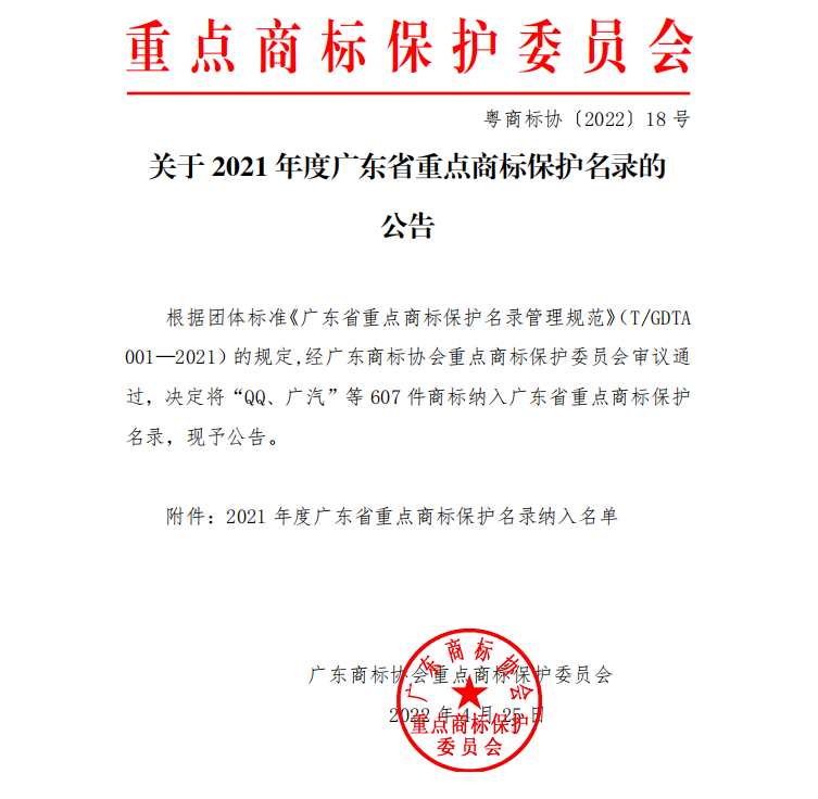 4月25日,廣東省商標協(xié)會公布了《2021年度廣東省重點商標保護名錄納入名單》,共計607件商標被納入名錄。“星藝裝飾”商標入選《2021年度廣東省重點商標保護名錄納入名單》。