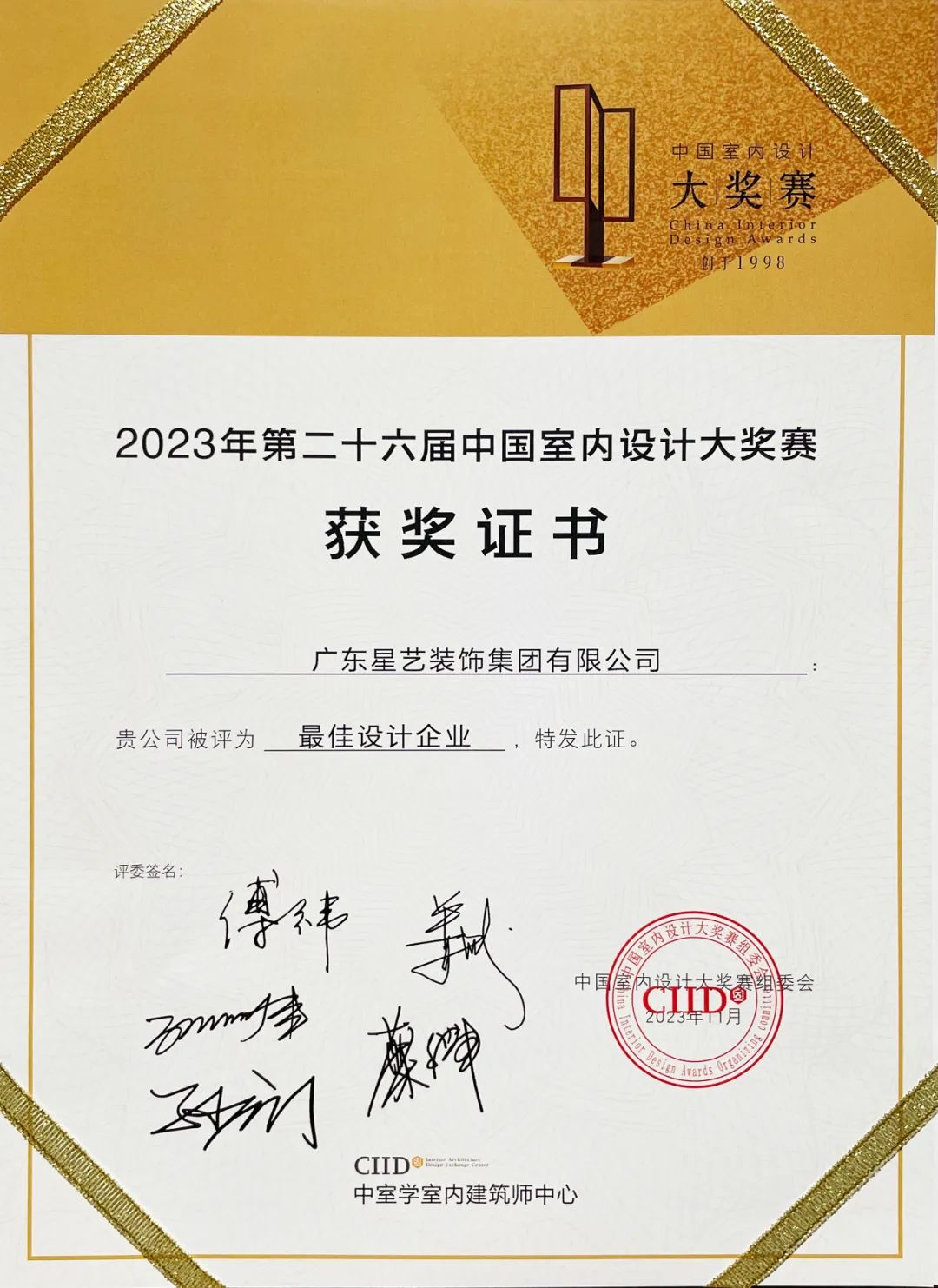 喜訊|星藝裝飾榮獲2023年第二十六屆中國(guó)室內(nèi)設(shè)計(jì)大獎(jiǎng)賽“最佳設(shè)計(jì)企業(yè)”