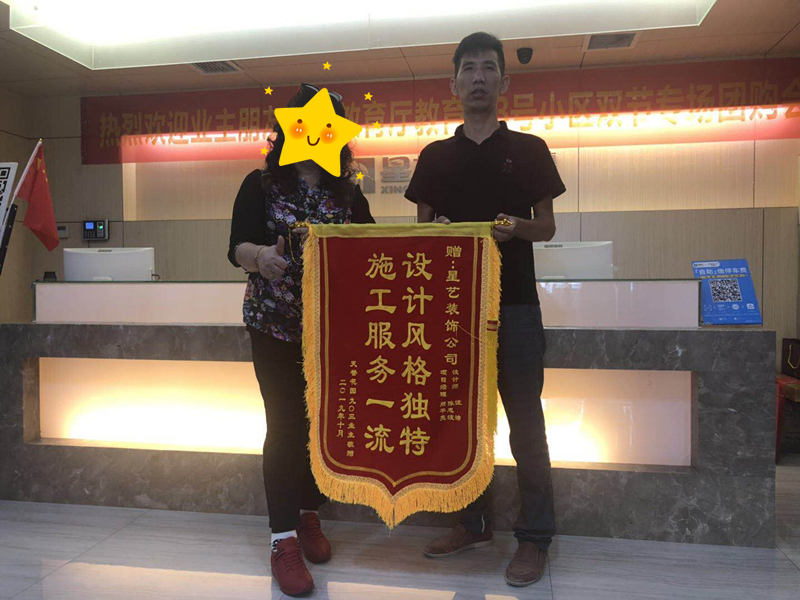 2019年10月,又一位天譽(yù)花園的業(yè)主送來錦旗,這是設(shè)計(jì)師陳忠波 項(xiàng)目監(jiān)理 周平亮近一個(gè)月收到的第二面錦旗,錦旗內(nèi)容:施工服務(wù)一流 設(shè)計(jì)風(fēng)格獨(dú)特
