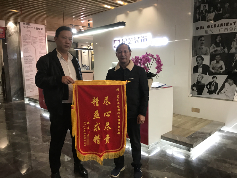2019年12月24日,昌泰茗城的業(yè)主李先生來到星藝裝飾匯東店,親手贈予易生教項目經(jīng)理錦旗表示感謝,錦旗內容:精益求精 盡心盡責