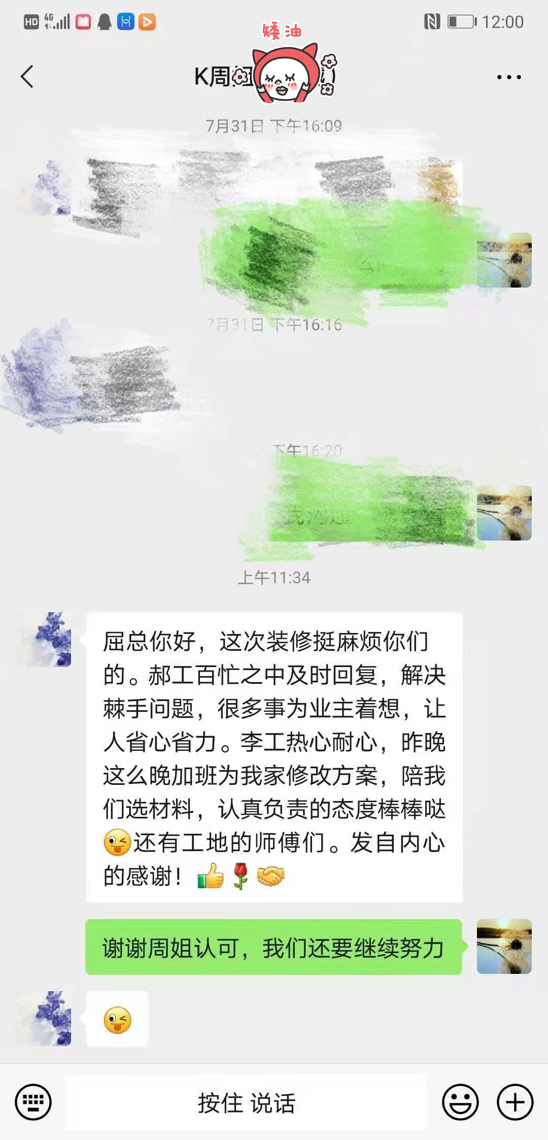 “屈總你好,這次裝修挺麻煩你們的,郝工百忙之中及時回復(fù),解決棘手問題,很多事為業(yè)主著想,讓人省心省力。李工熱心耐心,昨晚這么晚加班為我家修改方案,陪我們選材料,認(rèn)真負(fù)責(zé)的態(tài)度棒棒噠,還有工地的師傅們,發(fā)自內(nèi)心的感謝!”