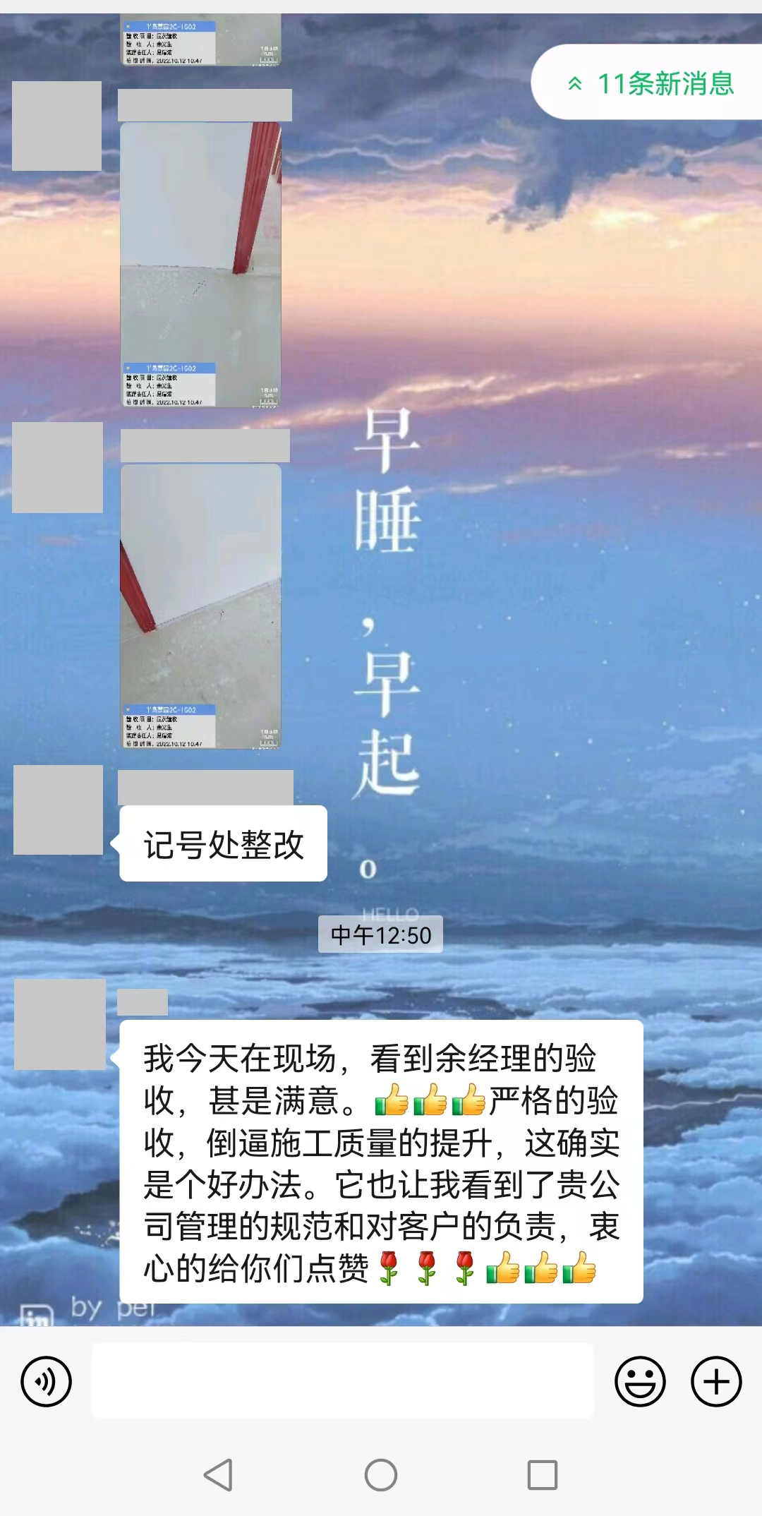 我今天在現(xiàn)場,看到余經(jīng)理的驗收,甚是滿意。嚴格的驗收,倒逼施工質量的提升,這確實是個好辦法,這也讓我看到了貴公司管理的規(guī)范和對客戶負責,衷心的給你們點贊!