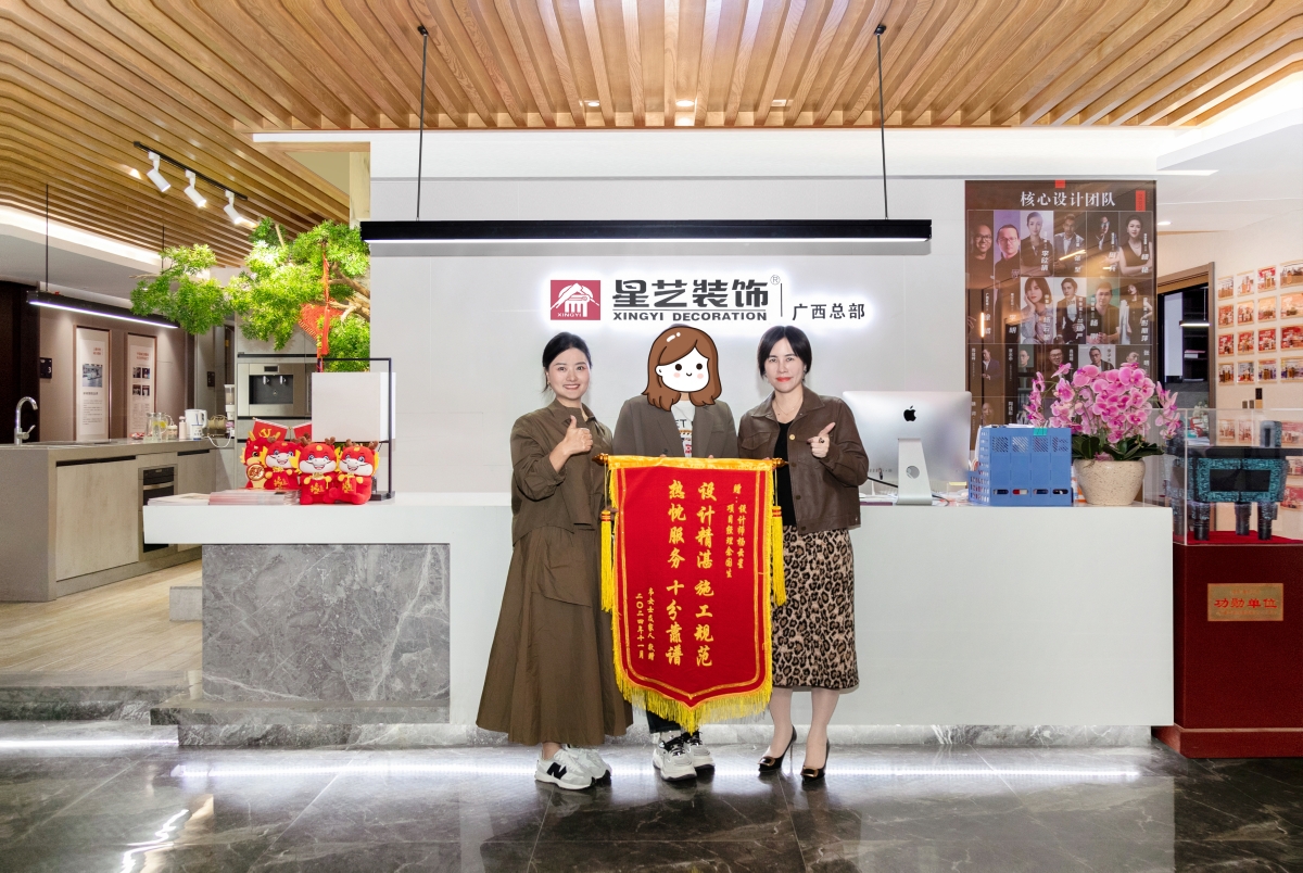在南寧星藝裝飾廣西總部店,今日迎來了一幕溫馨而感人的場景。業(yè)主韋女士滿懷感激之情,親手將一面熠熠生輝的錦旗贈予設(shè)計師總監(jiān)楊云星,錦旗上鐫刻著“熱忱服務(wù) 十分靠譜 設(shè)計精湛 施工規(guī)范”的贊譽之詞,字字珠璣,映照出雙方合作的無間默契與卓越成果。