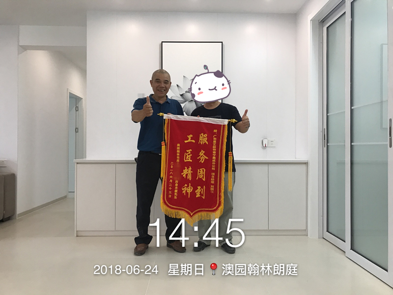 2018年6月23日,奧園瀚林朗庭業(yè)主送來(lái)錦旗稱贊廣東星藝裝飾南寧公司項(xiàng)目經(jīng)理劉國(guó)江工匠精神,服務(wù)周到。