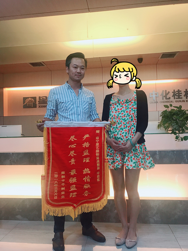 2018年8月,榮和千千樹美美的孕婦業(yè)主送來錦旗一副,稱贊星藝裝飾項目經(jīng)理李乾乾盡心盡責(zé),最強(qiáng)監(jiān)理,嚴(yán)格監(jiān)理,熱情服務(wù),該項目星藝裝飾設(shè)計師呂志良和業(yè)主合影。