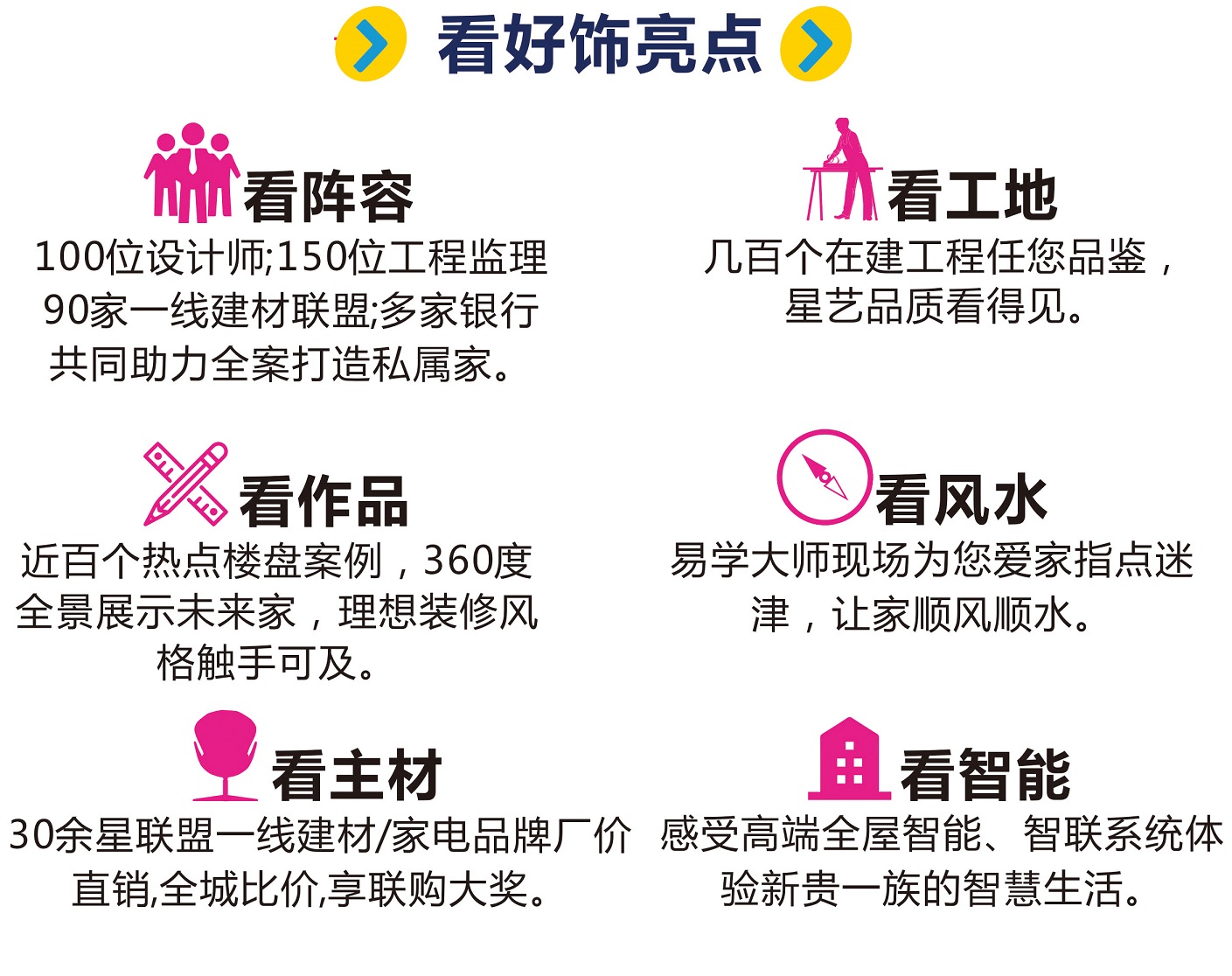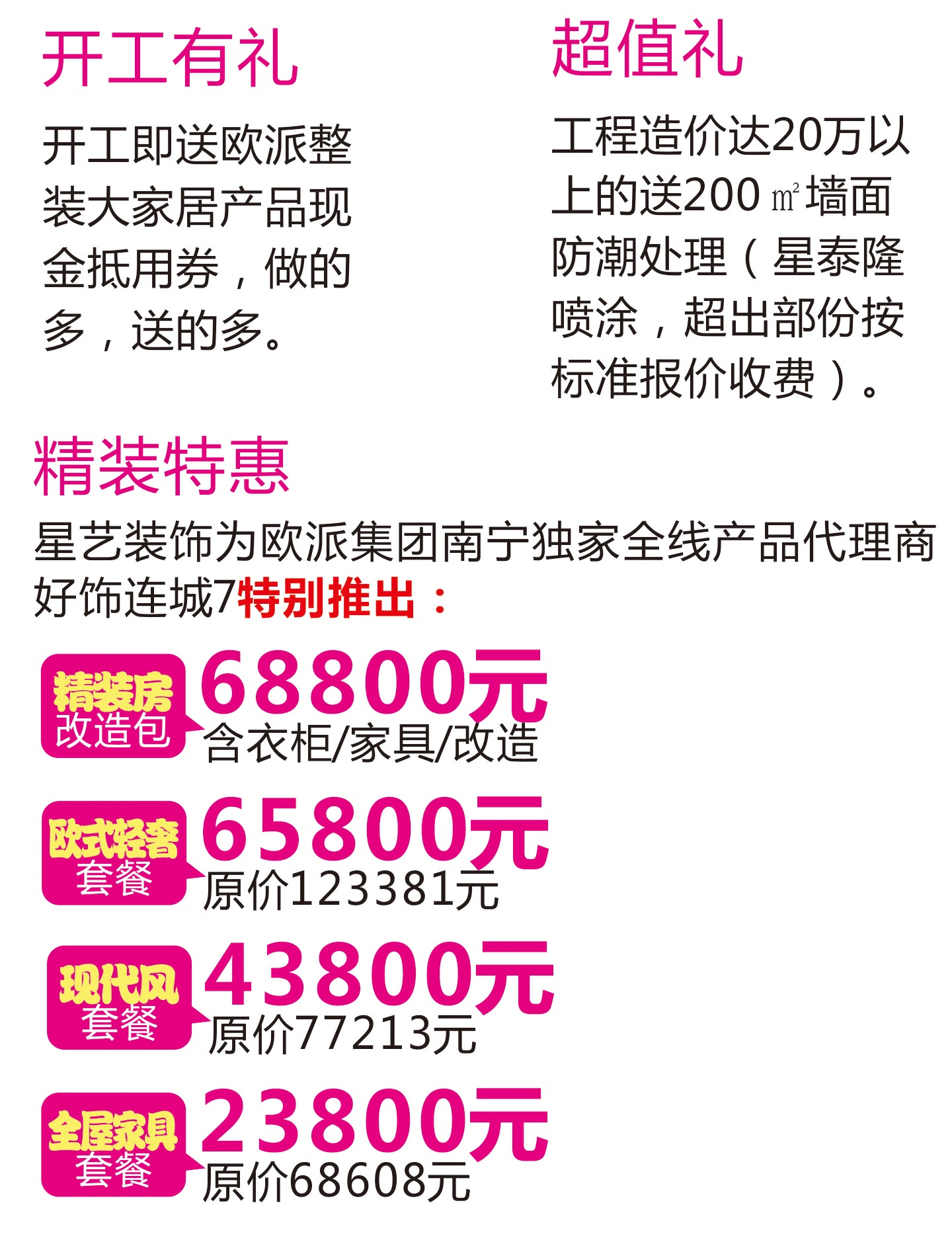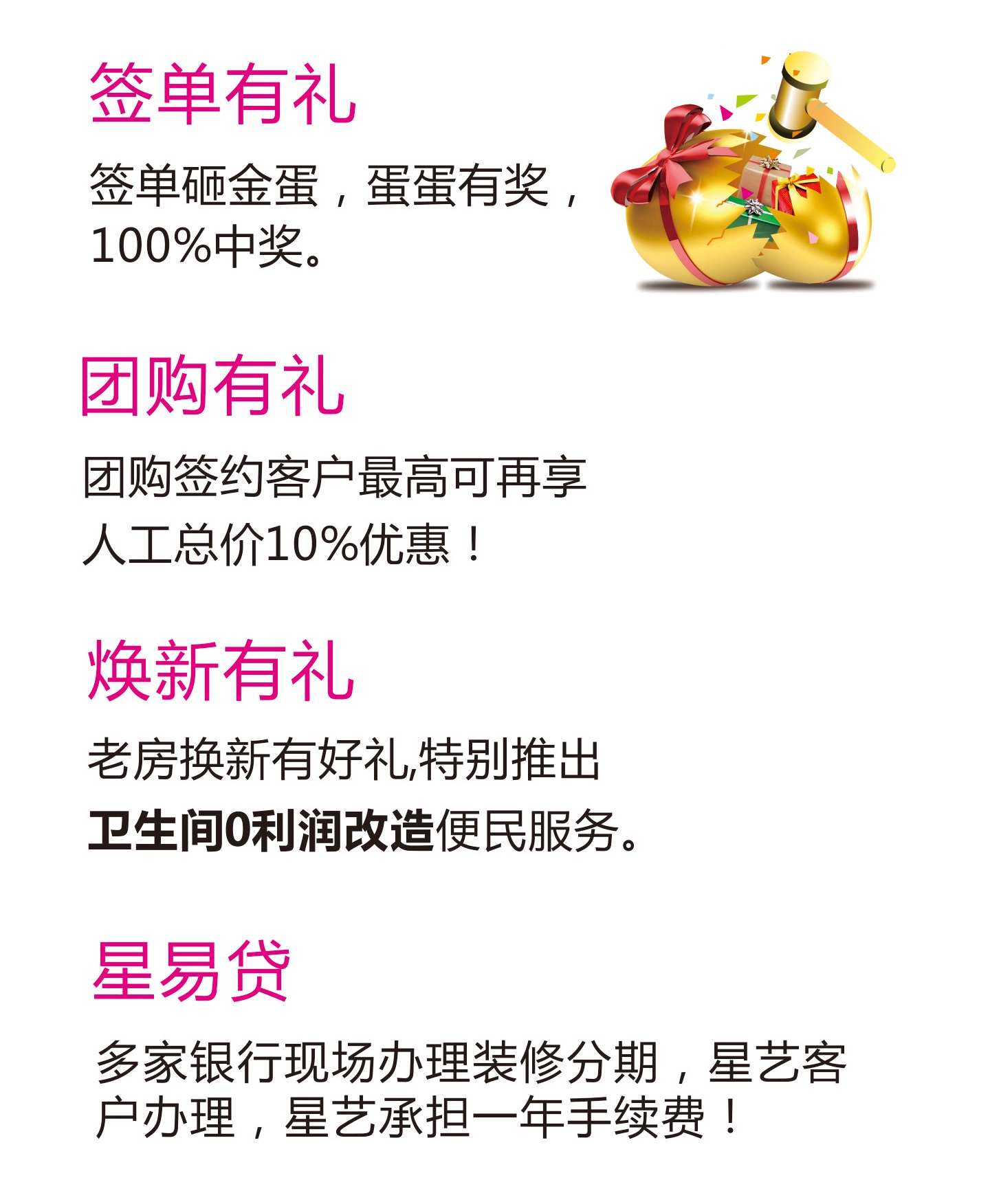 星藝人秉承做良心工程,本著對客戶負(fù)責(zé),對自己負(fù)責(zé)的態(tài)度,工程決不外包,承諾工程質(zhì)量有問題,砸掉免費(fèi)重做!“好飾連城”好飾好屋、好事連連、幸福連連,好禮大放送,