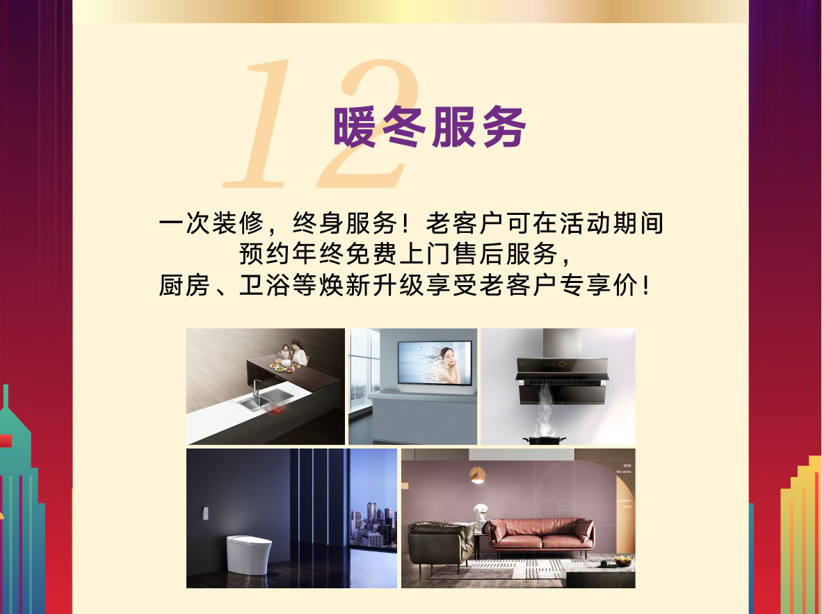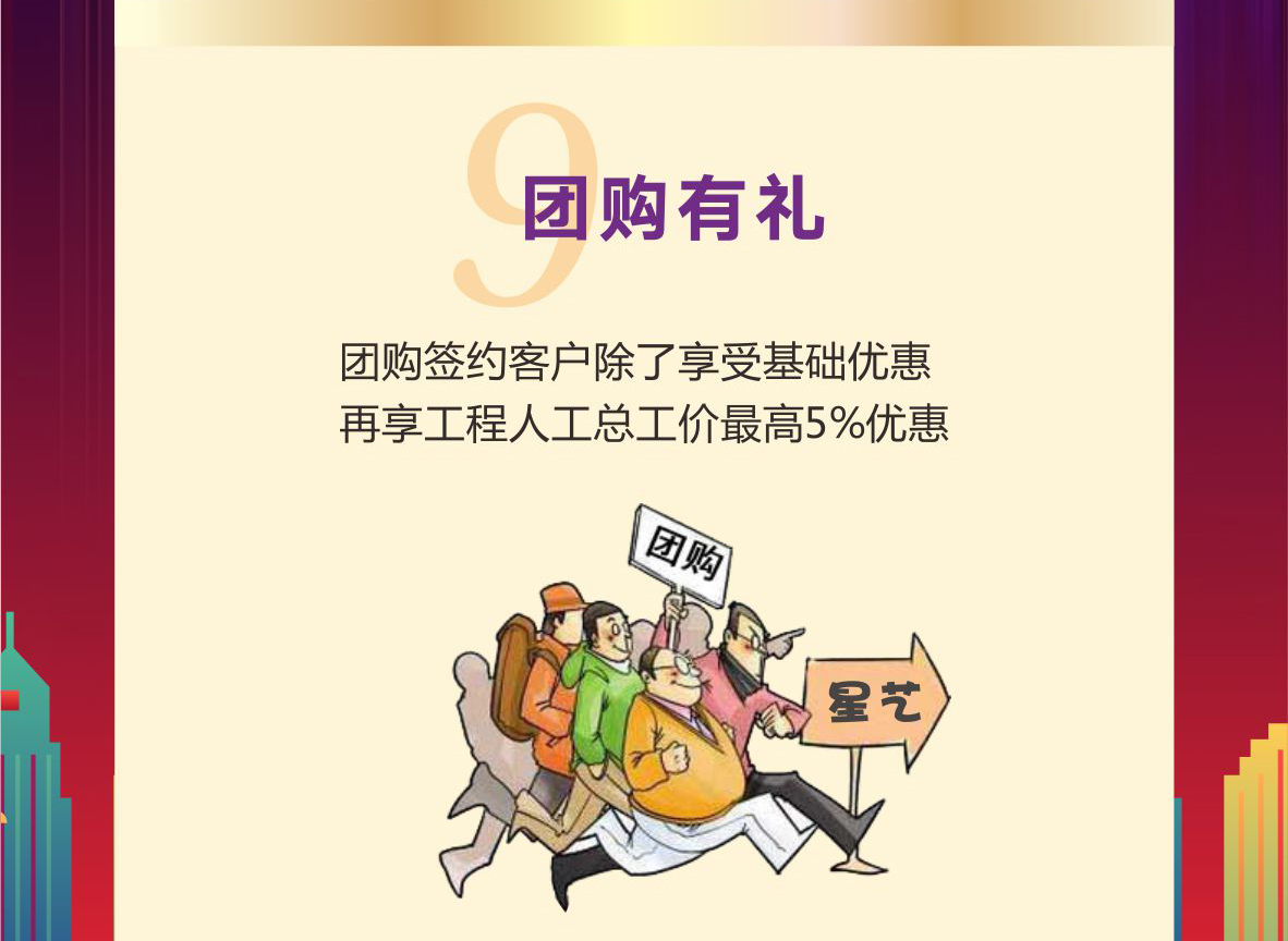 環(huán)保、運輸、限電政策嚴格管控下,材料上漲、人工上漲導(dǎo)致裝修成本越來越高。為減少業(yè)主裝修煩腦,回饋廣大新老客戶,按集團總部統(tǒng)一部署,舉行2021年“歲未感恩.暖冬行動”全國跨年鉅惠大聯(lián)動活動,給八桂裝修業(yè)主帶來一場保質(zhì)更保價的高品質(zhì)家裝盛會。本次活動星藝特別承諾:活動期間下定,2022年裝修享2021年單價等以下多重好禮鉅惠,具體優(yōu)惠細則如下: