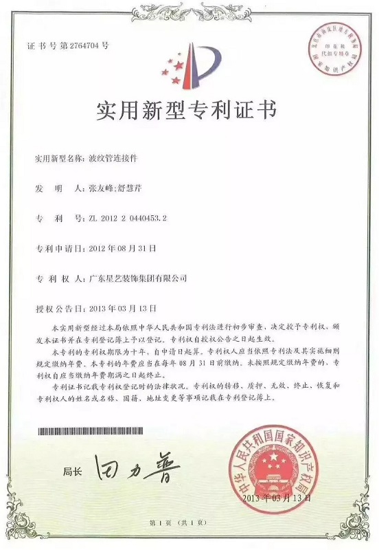 答:星藝裝飾中國建筑裝修裝飾工程專業(yè)承包壹級企業(yè),同時也首創(chuàng)“裝修質(zhì)量錘宣言”--讓工地開口說話!而且星藝裝飾還研發(fā)出“窗臺大理石防水結(jié)構(gòu)”“波紋管連接件”“電線管45度角和90度角轉(zhuǎn)彎連接件”等近30項(xiàng)國家實(shí)用新型專利和外觀設(shè)計(jì)專利。這些工藝通過每位星藝人的不懈努力不斷研發(fā)環(huán)保創(chuàng)新型工藝至今已推出近30項(xiàng)自主研發(fā)改良的專利技術(shù),接下來展示部分專利: