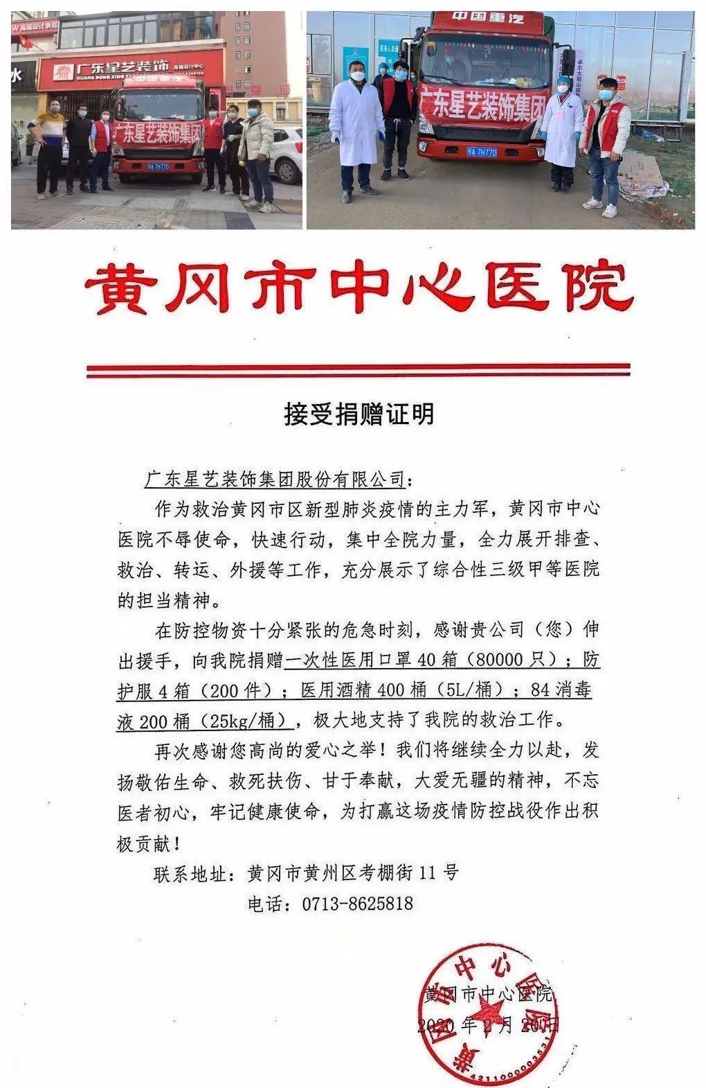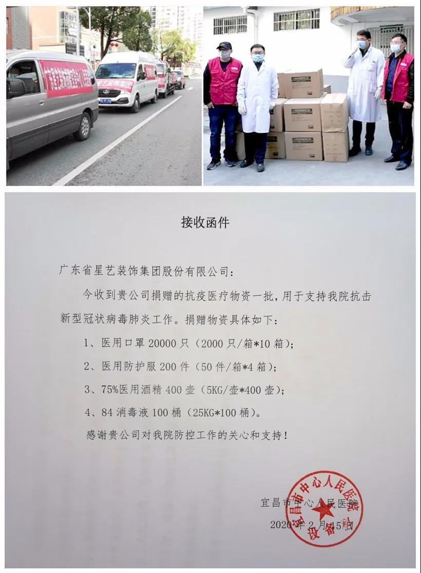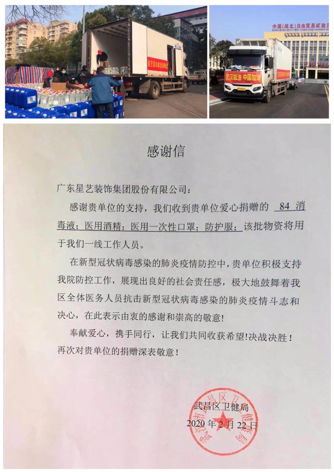 截至2月27日,星藝裝飾“愛心接龍”籌款共計220多萬元。22日前,通過湖北省慈善總會協(xié)調,愛心物資分三批向湖北宜昌、武漢、黃岡定向捐贈的醫(yī)用口罩、防護服、醫(yī)用酒精等愛心物資已經(jīng)全部到位,將每份愛心落到實處。