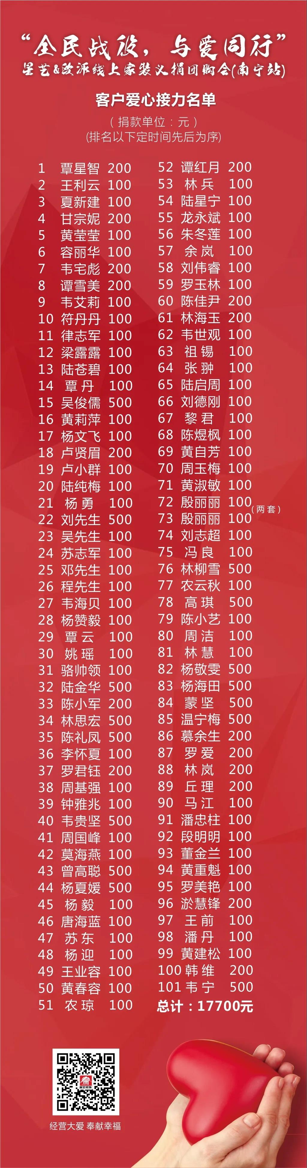 在星藝南寧分公司攜手歐派集團通過“開年大飾·與愛同行”線上家裝義捐團購惠活動中,又獲一百多位客戶信任,加入戰(zhàn)“疫”行動,經(jīng)過統(tǒng)籌安排,此次客戶的“愛心”將通過星藝集團抗擊疫情籌措物資委員會繼續(xù)向武漢和湖北省內(nèi)疫情嚴重的地市落實各項定向捐贈,本次活動“愛心名單”公示如下: