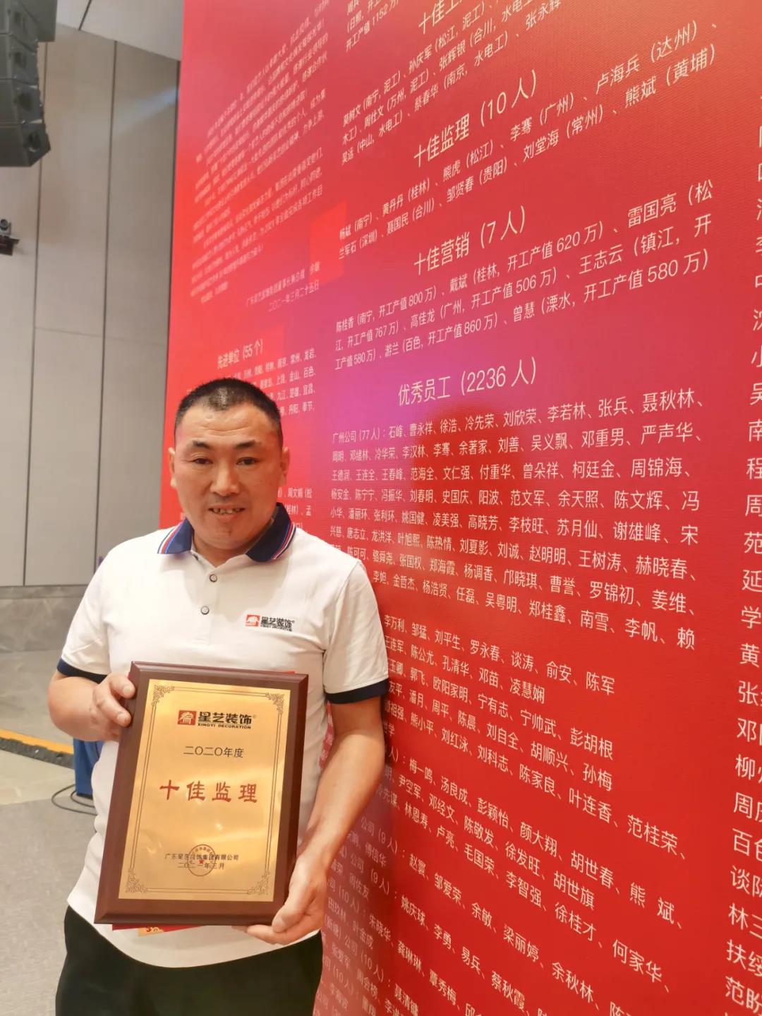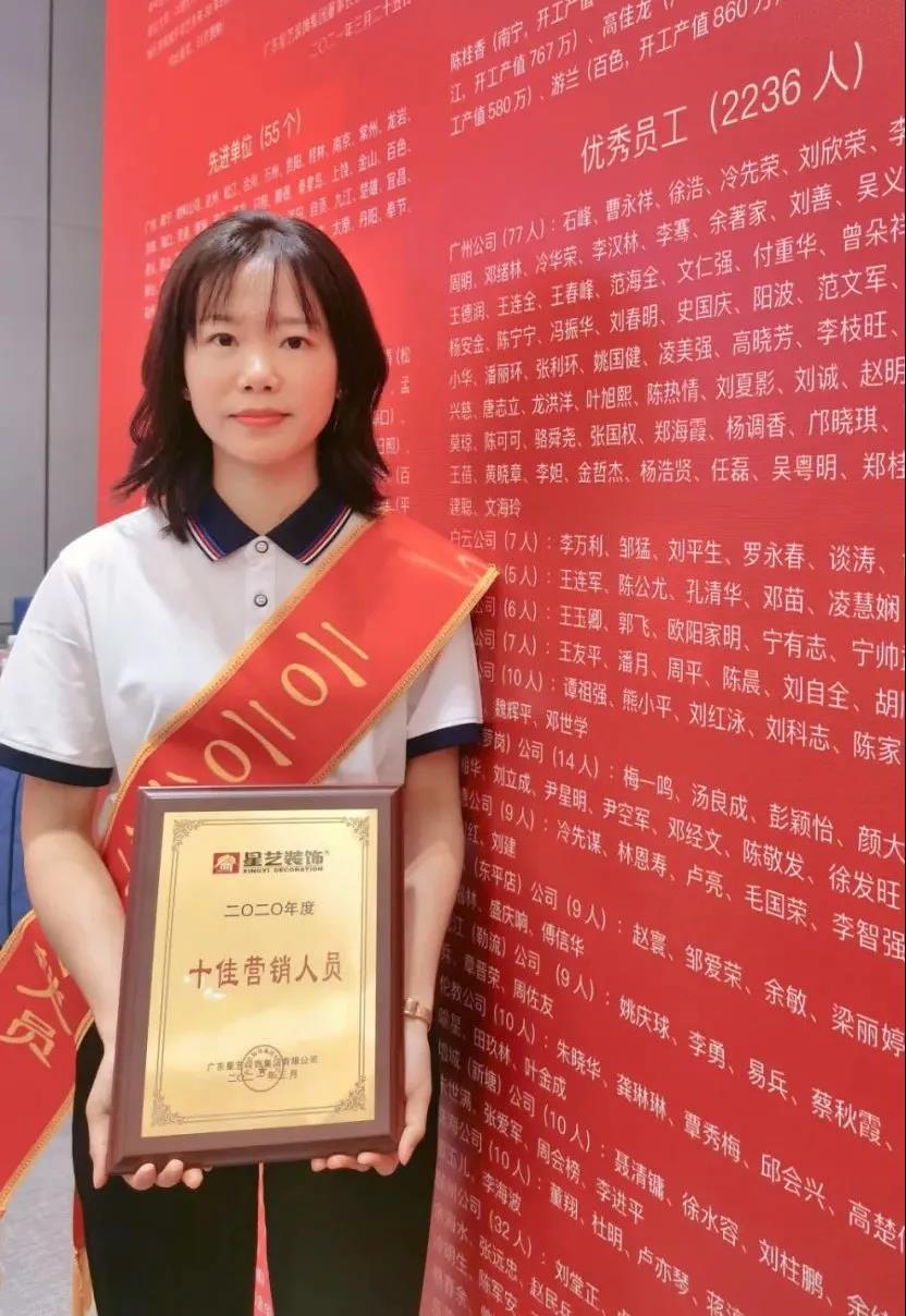 在本次大會上,星藝南寧分公司榮獲集團(tuán)總部2020年度“先進(jìn)單位”榮譽(yù)!同時,還有星藝南寧區(qū)域總經(jīng)理周平生榮獲"優(yōu)秀經(jīng)理“,南寧區(qū)域總監(jiān)李明、富安居設(shè)計中心總監(jiān)張至榮獲“優(yōu)秀總監(jiān)”,網(wǎng)銷部陳桂香榮獲“十佳營銷員”,廣西總部設(shè)計師周兵榮獲“千萬設(shè)計師”,工程部監(jiān)理楊斌“十佳監(jiān)理”,工程施工員莫樹文榮獲“十佳工人",75位南寧星藝員工榮獲“集團(tuán)年度優(yōu)秀員工”。備受矚目,“星”光閃耀!