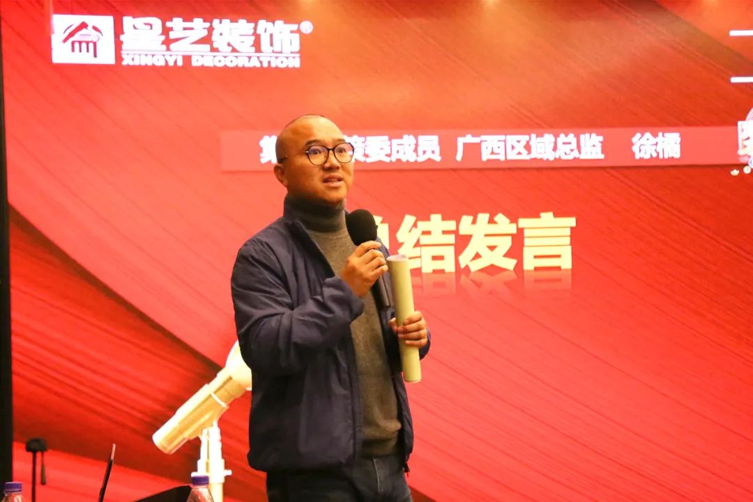 最后,集團決策委成員、廣西區(qū)域設(shè)計總監(jiān)徐橘做會議總結(jié),徐總先是以南寧裝修市場形勢做了簡要的分享,并結(jié)合自己去外地市場考察,見到一些新的東西,分享到“因為市場在變化,行業(yè)在變化,不管是工程部也好,營銷部、設(shè)計部也好,相互之間一定要懂得總結(jié)和復(fù)盤。”通過慢慢地去做一些市場的復(fù)盤,去解決細部節(jié)點的問題,保持活躍性,不斷調(diào)整自己的模式,從而打造出企業(yè)的共同目標(biāo)。