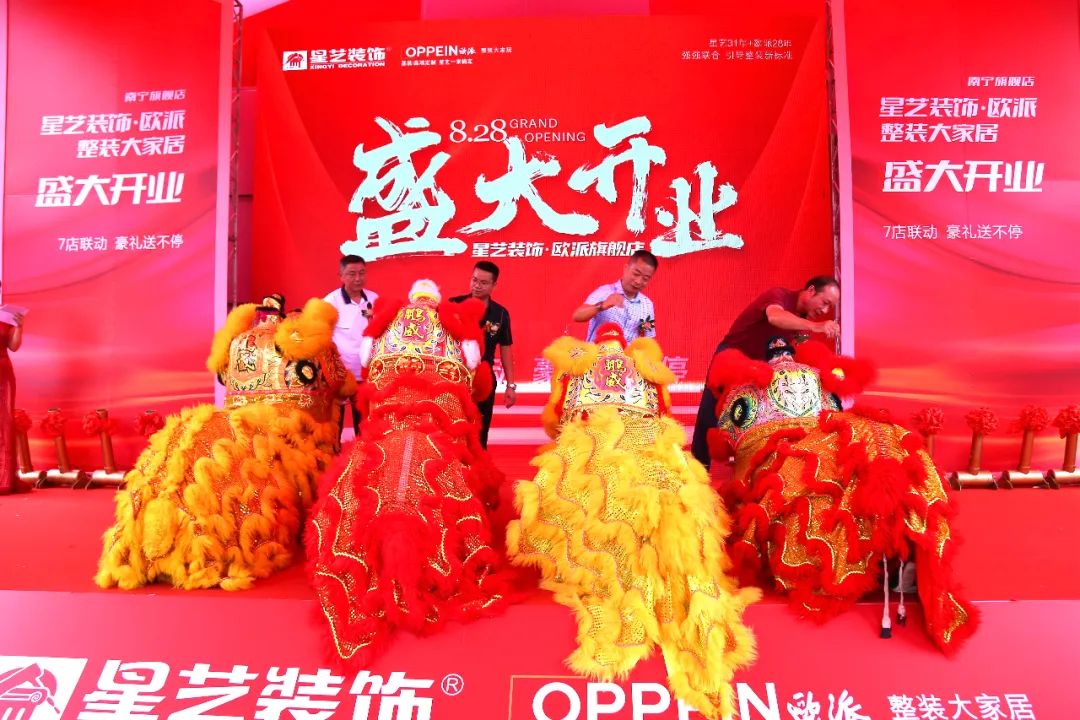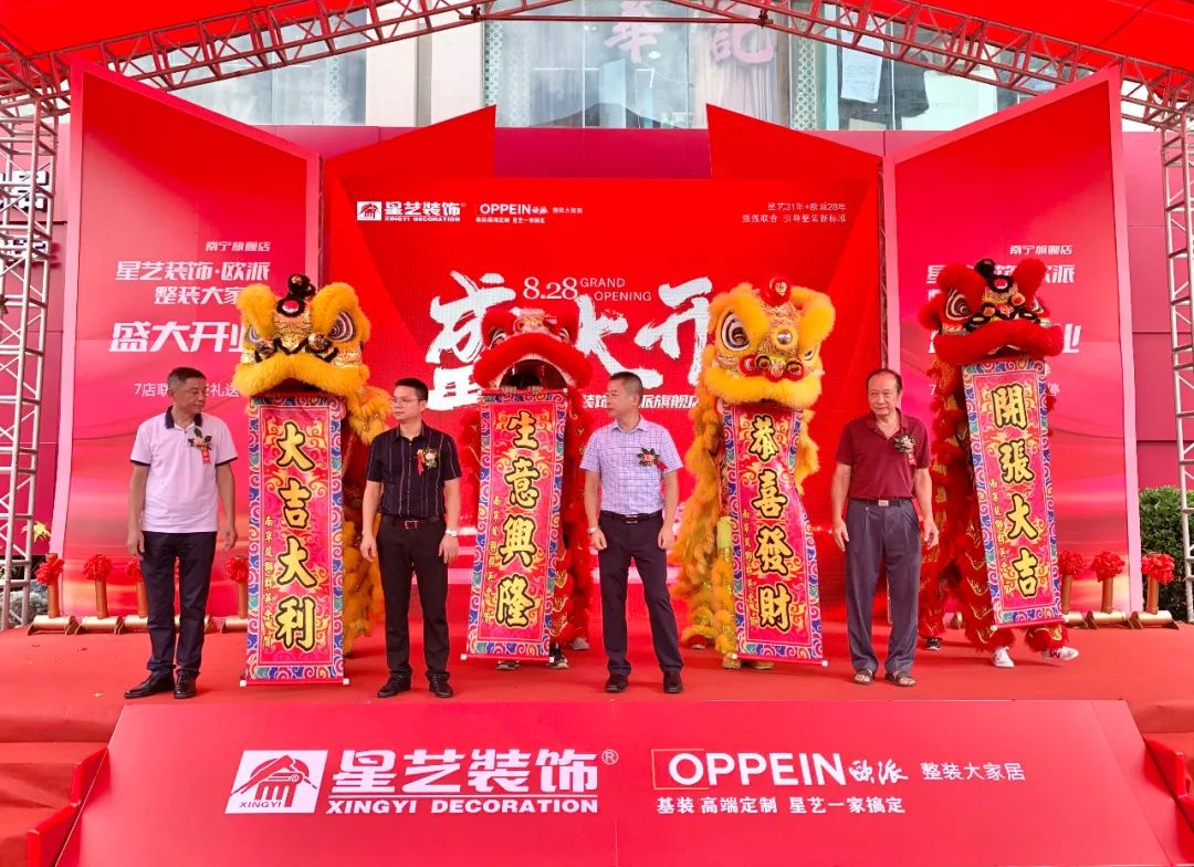 在現(xiàn)場熱火朝天的氛圍下,開業(yè)慶典進(jìn)入“醒獅點(diǎn)睛”環(huán)節(jié),由廣西裝飾協(xié)會(huì)秘書長兼家裝委員會(huì)輪值會(huì)長譚謙譚會(huì)長、星藝客戶代表唐老師、歐派整裝經(jīng)銷二部總監(jiān)黃亮亮、星藝南寧區(qū)域總經(jīng)理周平生為醒獅點(diǎn)睛,寓意虎虎生威,事業(yè)興旺,宏圖大展,再創(chuàng)輝煌。