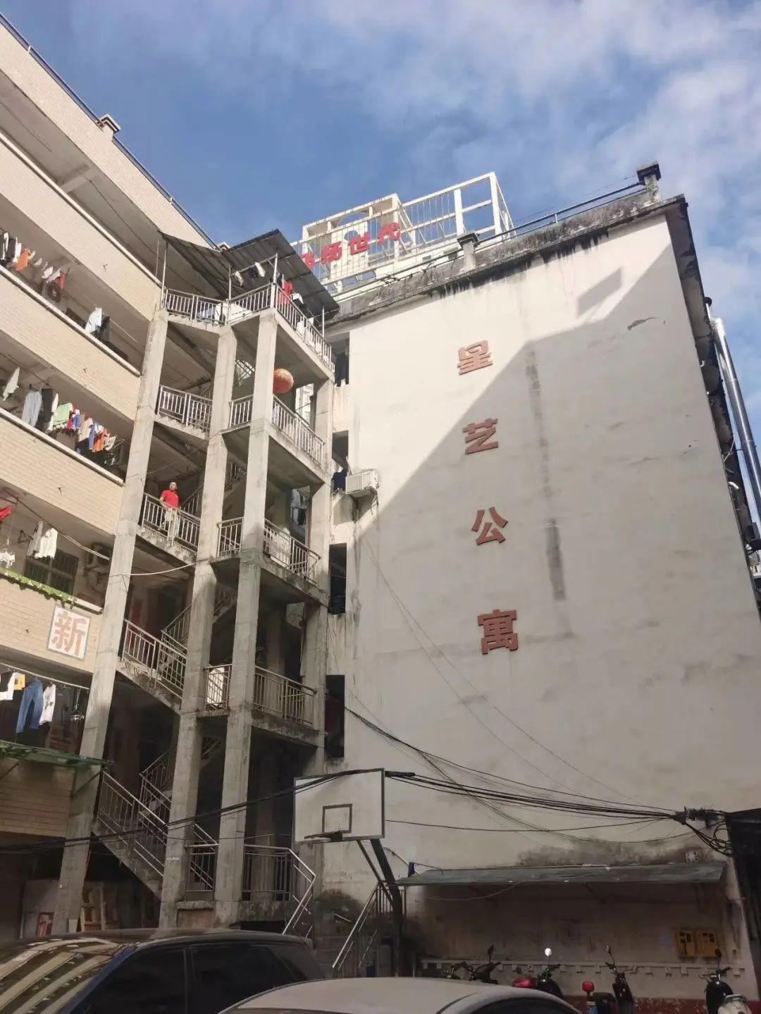 循童聲前往,見遠處一棟樓的外墻上有“星藝公寓”4字。一樓幼兒園里孩子們的歡聲笑語與之相伴。“之”字形老式步梯連接兩棟樓,公寓樓總體呈“U”形合抱狀。公寓樓共5層,一樓設倉庫、食堂、工程部辦公室、材料部辦公室、財務辦公室、籃球場(現(xiàn)有一半被用作幼兒園)等,樓上則住人,居住者均為南寧星藝人及其家屬。