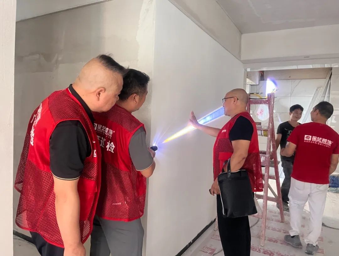 在檢查過程中,經(jīng)驗豐富的余工、吳工以及易經(jīng)理等一行人嚴格按照公司工程規(guī)范管理制度在工地上進行巡查,從墻面的平整度、用材的品質(zhì)到施工的工藝,幾位巡檢員現(xiàn)場溝通交流,上手檢查,連測帶量,精細到每一處細節(jié),力求保質(zhì)保量,為業(yè)主打造一個安全可靠的品質(zhì)新家。