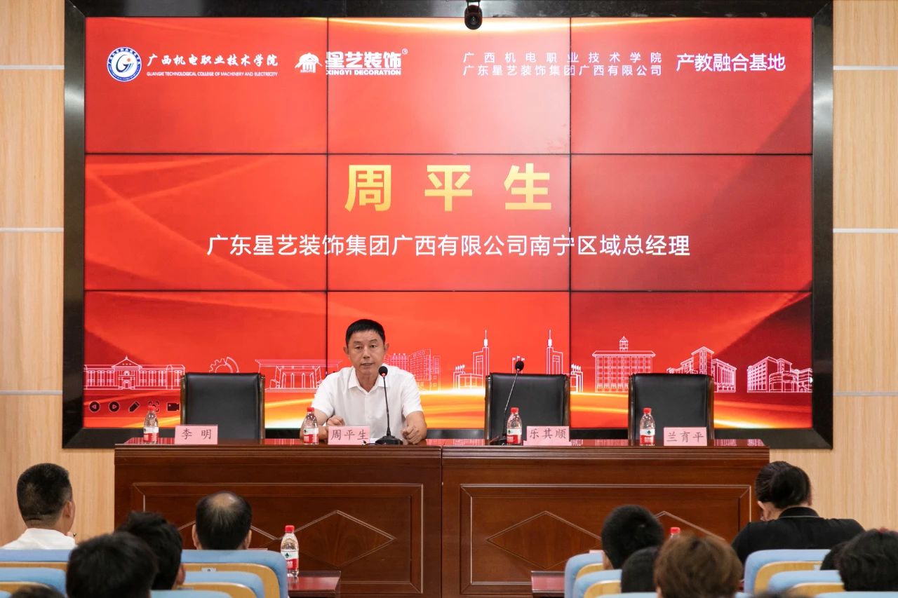 簽約會上,星藝南寧區(qū)域總經(jīng)理周平生介紹了企業(yè)的基本情況、業(yè)務(wù)范圍和今后發(fā)展戰(zhàn)略,闡述企業(yè)對‘星藝班’學(xué)生的培養(yǎng)期望和要求,表達星藝裝飾對人才的需求和校企合作的信心。
