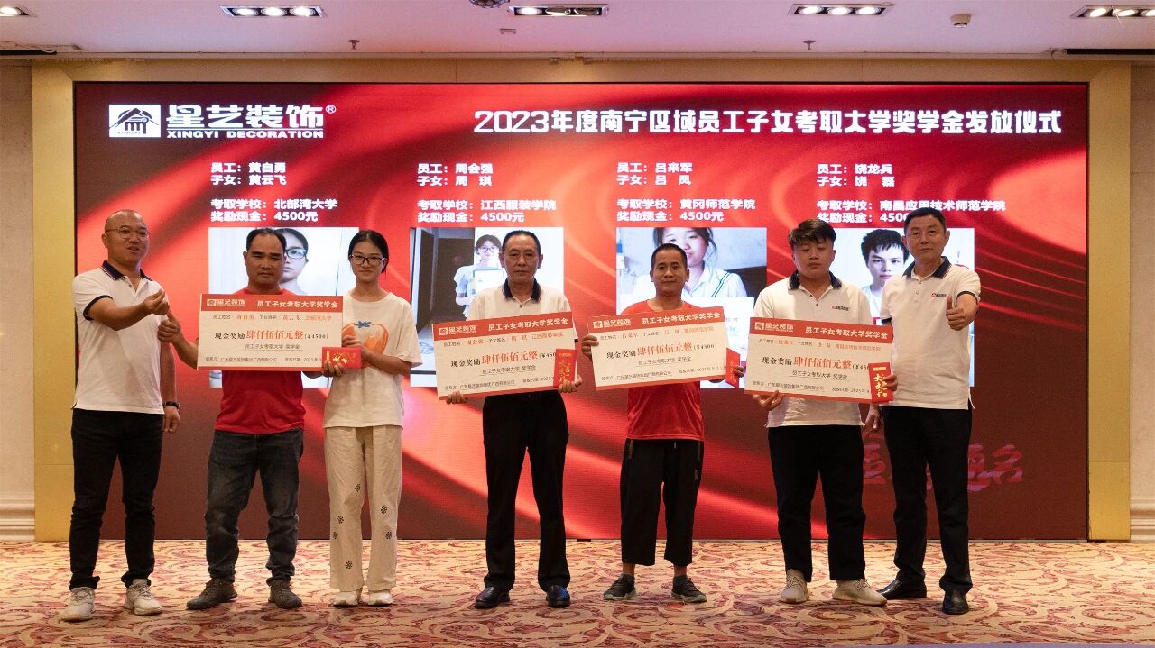 9月10日,2025年度星藝南寧區(qū)域員工子女大學(xué)獎(jiǎng)學(xué)金發(fā)放儀式在南寧金旺角國(guó)際酒店會(huì)議室溫情舉行,在四百多名星藝南寧家人的共同見(jiàn)證下,星藝南寧區(qū)域總經(jīng)理周平生、星藝南寧區(qū)域設(shè)計(jì)總監(jiān)李明為星藝員工劉筱萍、周平楊、陳海華、田茂東四位考上大學(xué)的“星二代”頒發(fā)星藝獎(jiǎng)學(xué)金,代表星藝裝飾關(guān)愛(ài)員工家庭,重視人才培養(yǎng),鼓勵(lì)“星二代”們奮發(fā)向上,努力學(xué)習(xí),在求學(xué)路上深耕精研,成為國(guó)家棟梁。