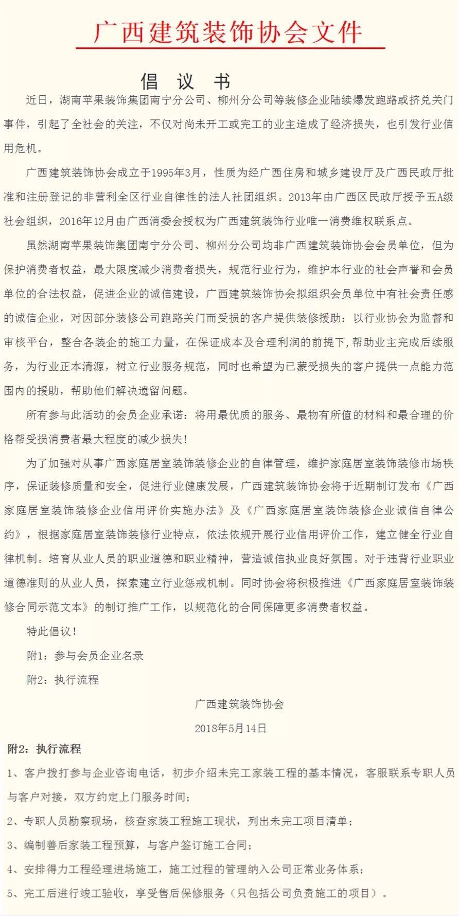 不僅如此,會上還發(fā)起行業(yè)倡議援助受損消費者。星藝南寧積極響應廣西建筑裝飾協(xié)會以及廣東星藝集團的號召:在業(yè)主自行負擔成本的前提下,為受損業(yè)主提供幫助。用優(yōu)質(zhì)的服務、合理的價格完成受損業(yè)主的后續(xù)工程,最大程度減少損失!